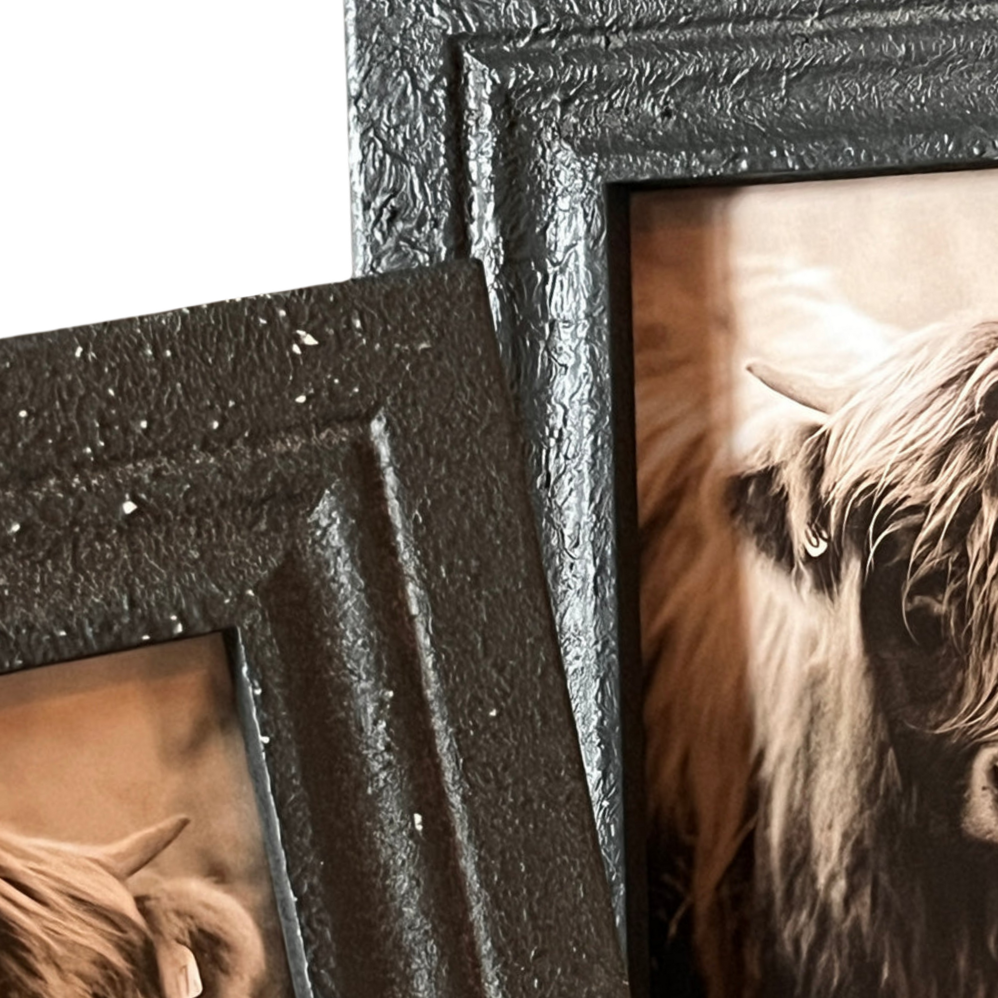 Prachtige stoere vintage foto lijst met de afbeelding van een schotste hooglander. Erg leuk met een foto of landelijke afbeelding er in, een echte must-have in een stoer sober en landelijk interieur.