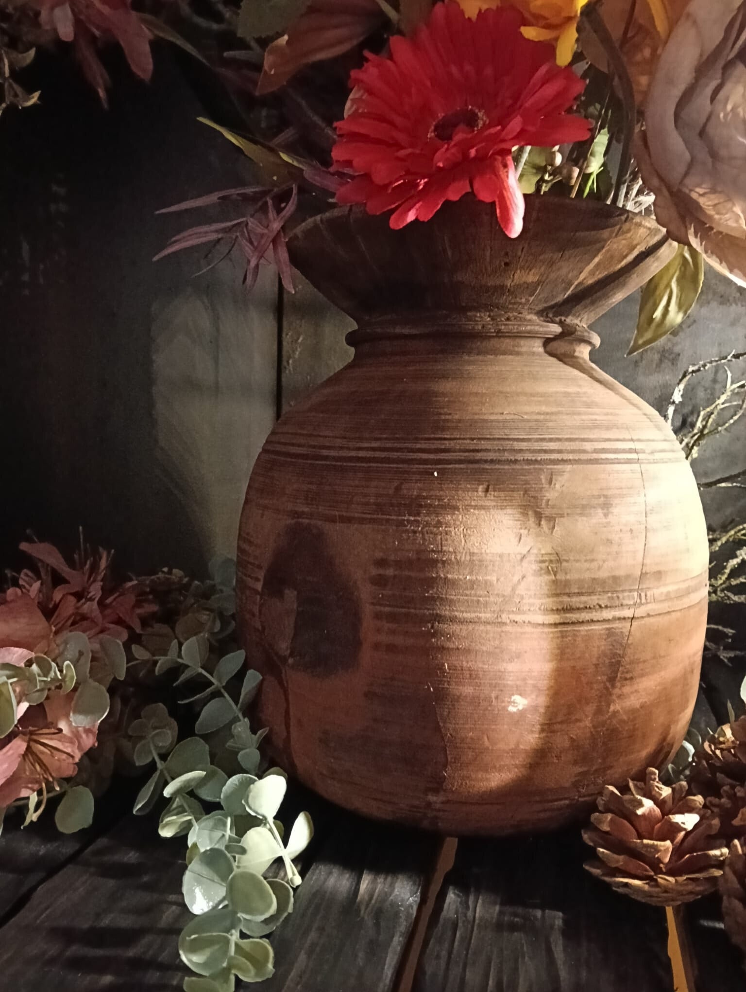 Traditionele handgesneden vintage houten nekpot. Deze Nepalese melkpot vormt de meest prachtige rustieke uitstraling en is perfect voor het bewaren van gedroogde bloemen of kunstbloemen. Alleen of als set is dit een pronkstuk voor je interieur.