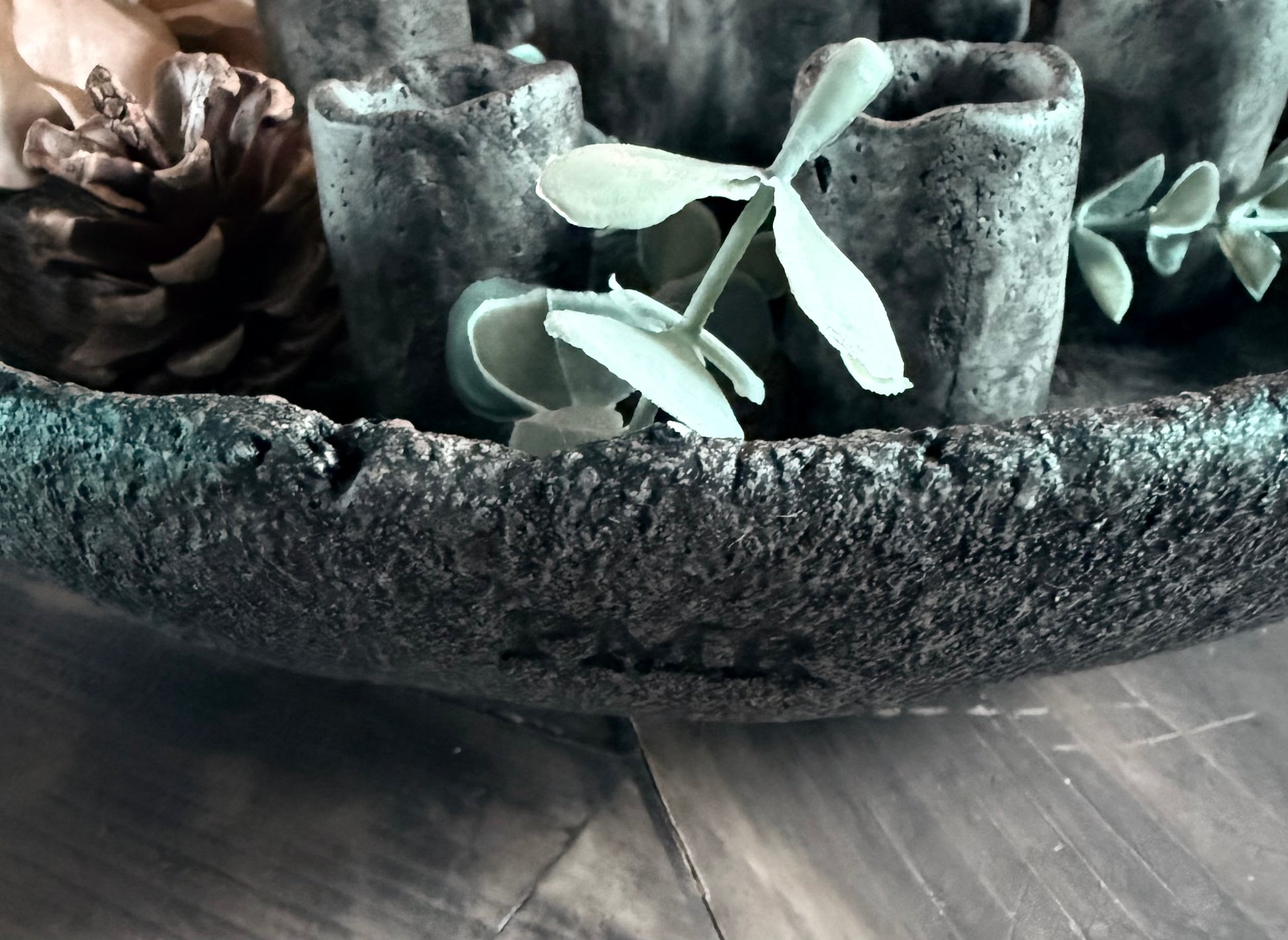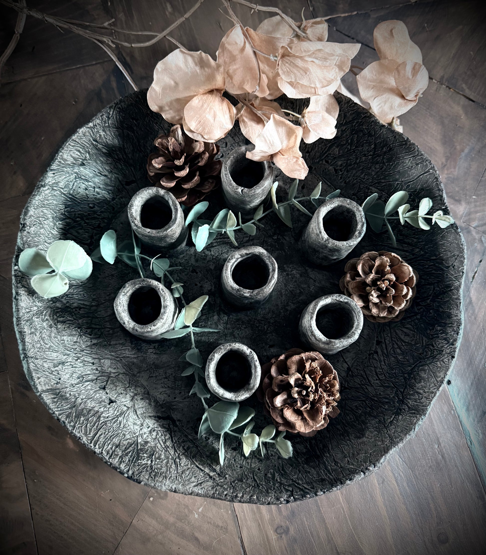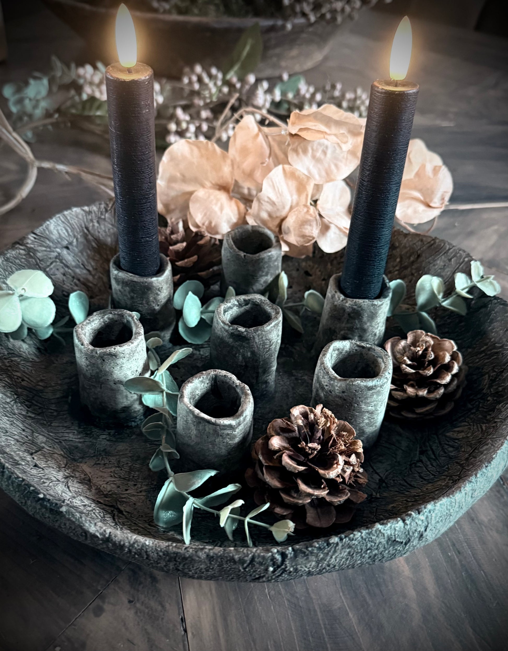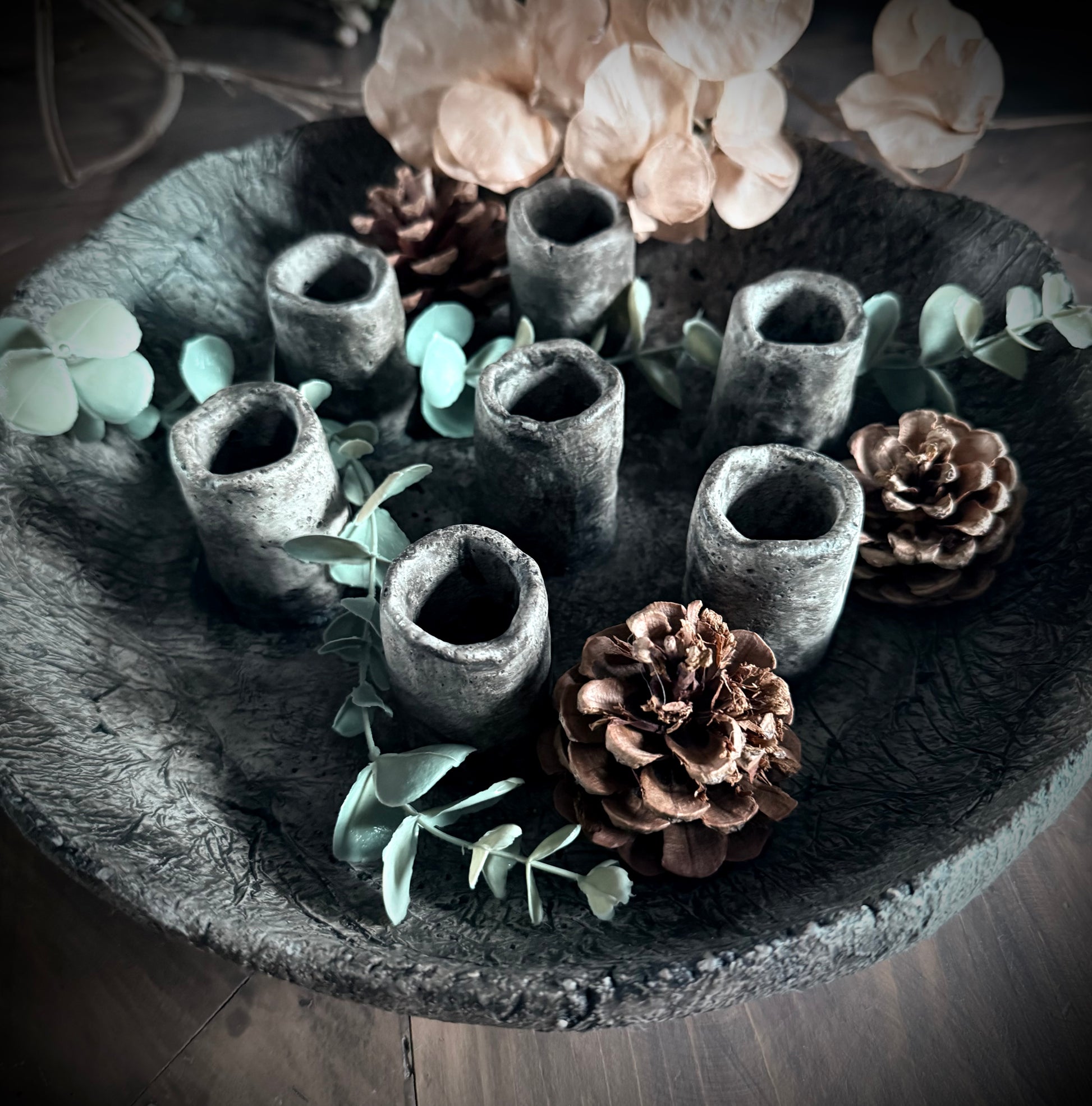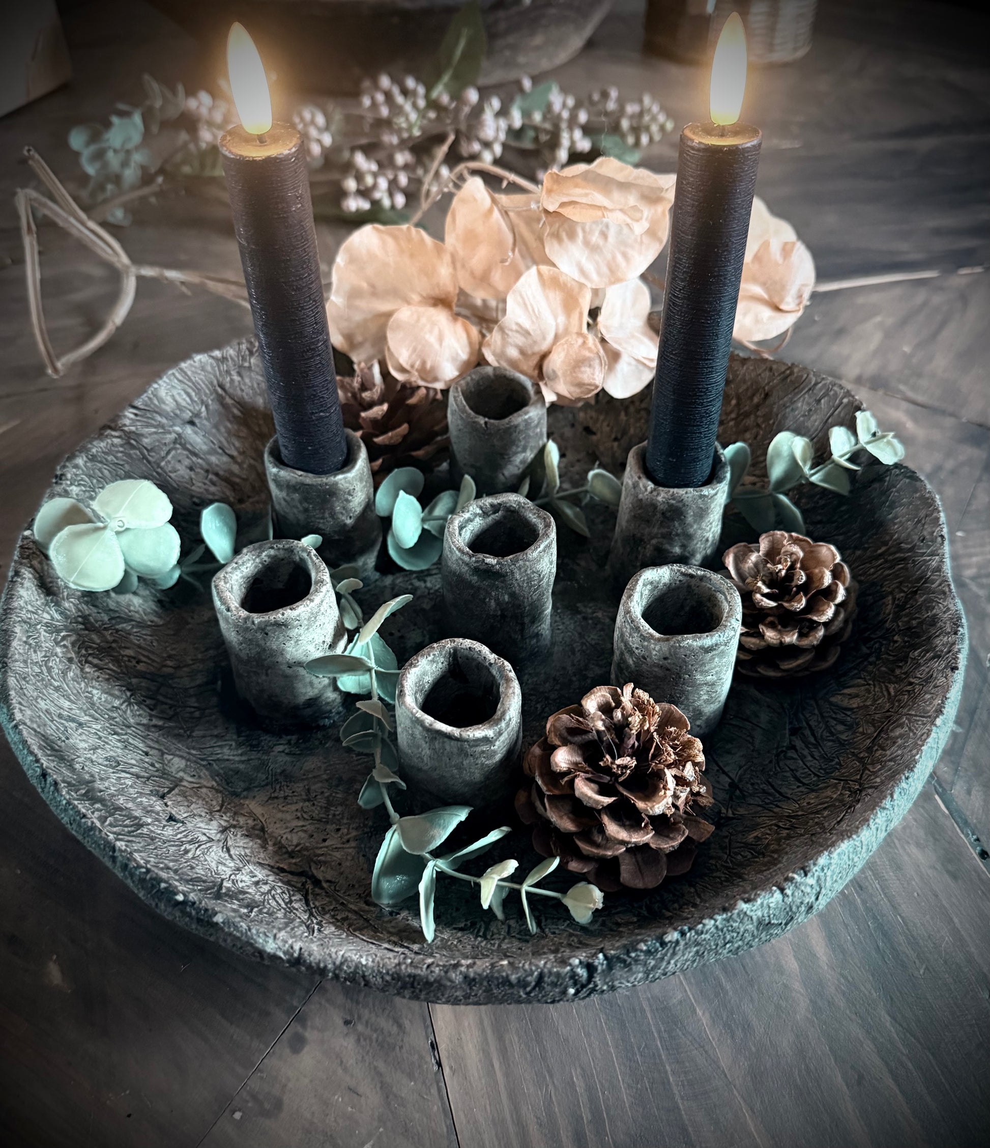 Prachtige schaal gemaakt van beton met plek voor 7 kaarsen.